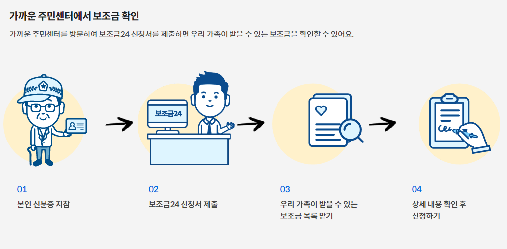 본인 신분증 지참하신 후 주민센터에 방문하시면 가족이 받을 수 있는 보조금 확인하실 수 있습니다.