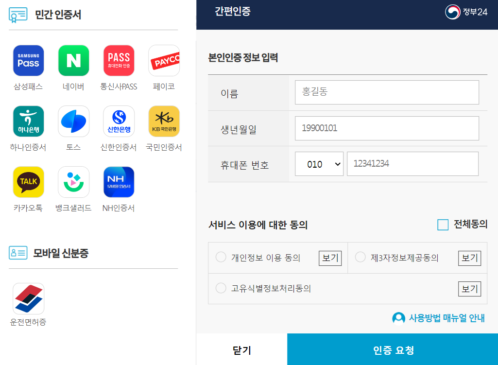 PC나 핸드폰을 이용하신다면 간편 인증으로 카카오톡이나 네이버로 인증하여 접속이 가능하고 공인인증서가 있다면 인증서 등록 후 이용 가능합니다. 만약에 처음 접속하거나 오랜만에 접속하시는 분은 카카오톡, 네이버, 통신사, 은행 등으로 접속이 가능한데 개인적으로는 카카오톡이 편했습니다.