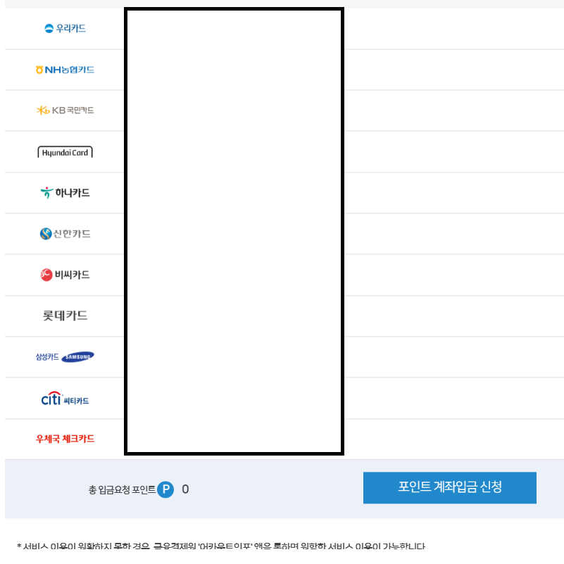 - 대부분의 포인트가 현금화 가능한 상태이지만, 카드사의 상황 등 제반여건에 따라 일부 이체되는 금액이 제외될 수  있습니다.